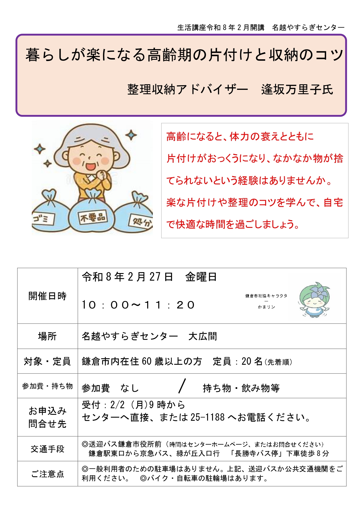 高齢になると、体力の衰えとともに片付けもつい億劫になって、『なかなか物が捨てられない』という経験もおありではないでしょうか。そこで、整理収納アドバイザーの逢坂万里子さんを講師にお招きし、楽な片付けや整理から快適なご自宅生活につながるコツを学びます。