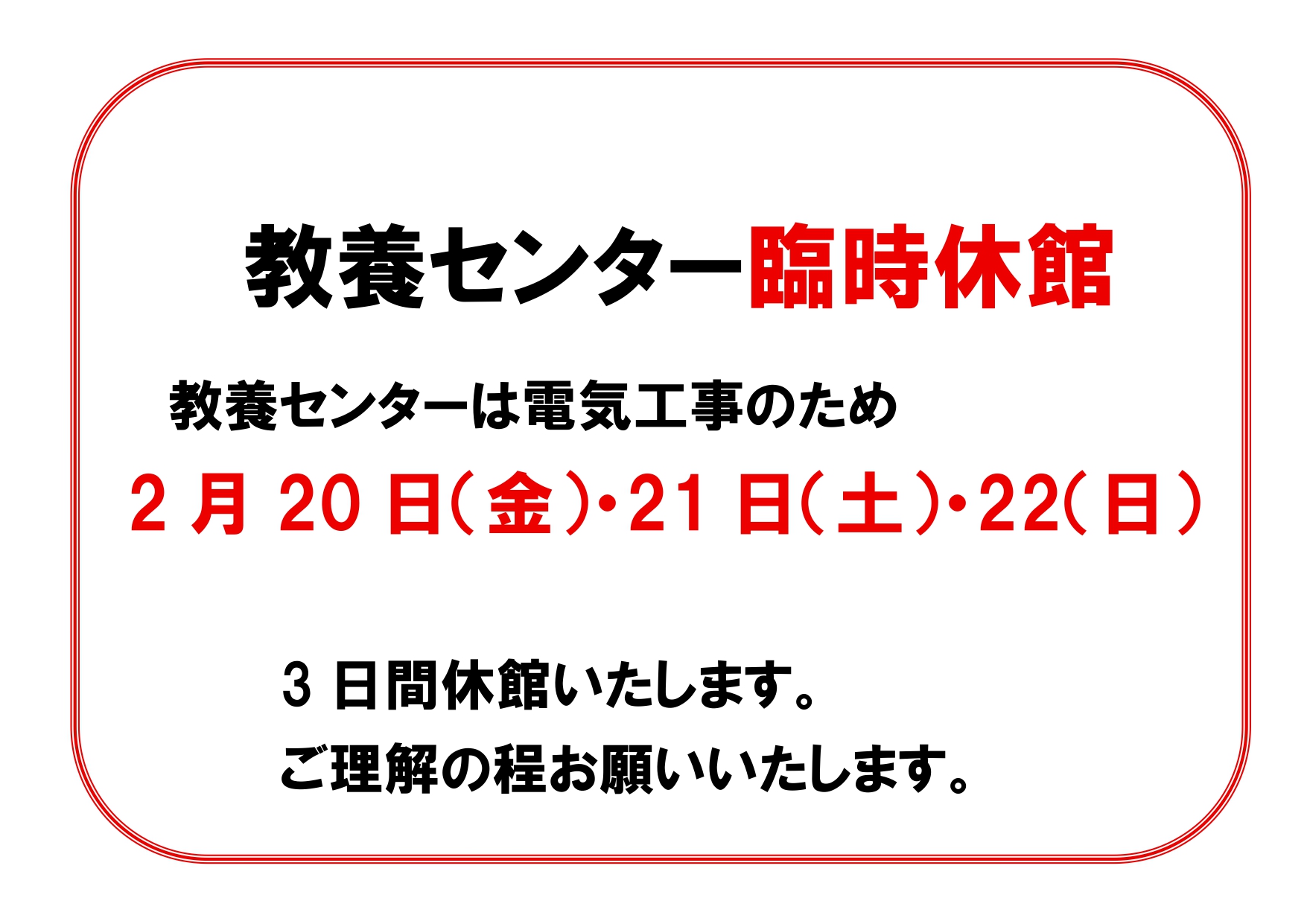 教養センター臨時休館2月20日(金)21日(土)22日(日)